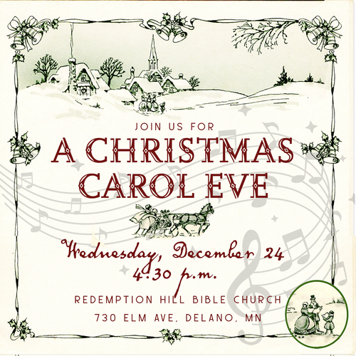 Join us for our annual Christmas Carol Eve Wednesday, December 24 at 4:30 for a joyful evening of traditional Christmas carols, fellowship, cookies and cider!